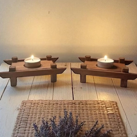 An Asian-inspired tea light holder suitable for indoor or outdoor use, designed to evoke tranquility and relaxation. This "rustic" tea light holder is crafted from untouched wood, showcasing the natural markings of cedar, thereby highlighting the wood's inherent beauty. Place it alongside your favorite Asian decorations on a table to enhance the ambiance. Includes one tea light candle per candle holder.